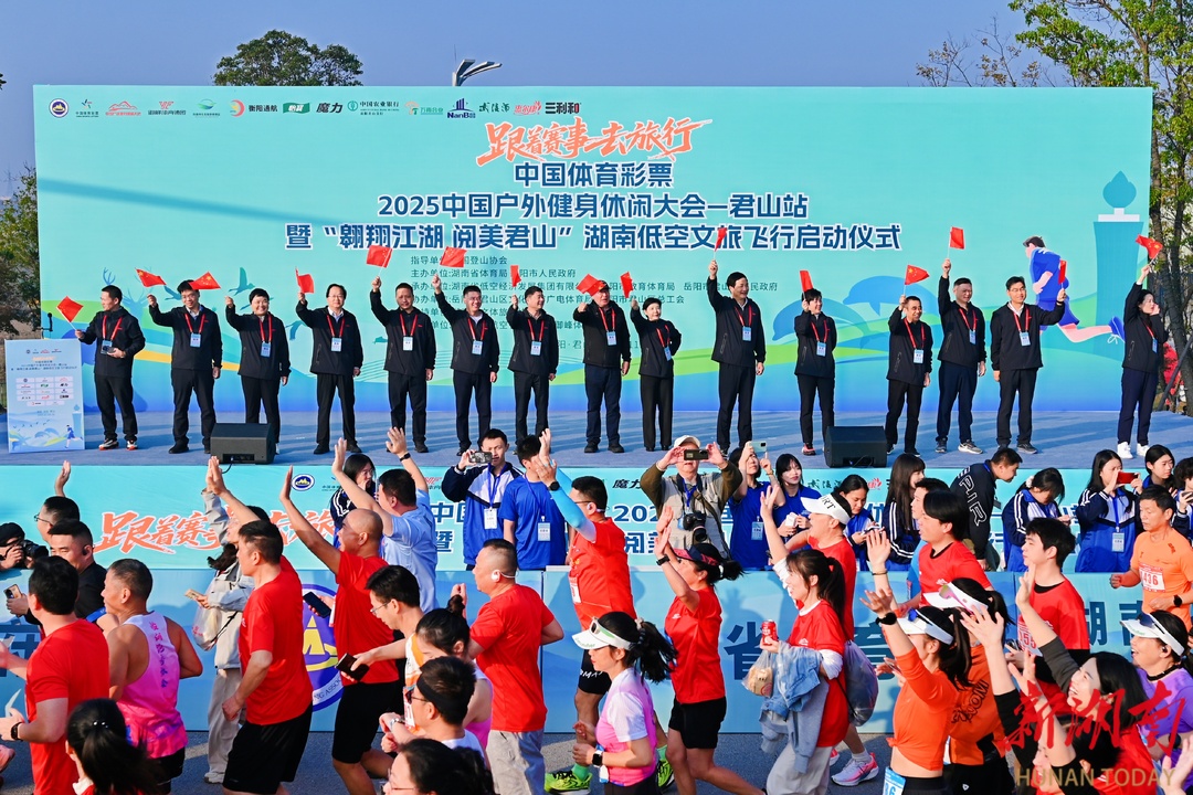 湖南日报·新湖南客户端11月15日讯(通讯员 竺芳梓 曾梦萍 吴梦娜)11月15日,迎着洞庭湖晨曦初露,近5000名户外运动爱好者齐聚岳阳市君山区“守护好一江碧水”展陈馆,在发令枪声中开启了2025中国户外健身休闲大会-君山站暨“翱翔江湖 阅美君山”湖南低空文旅飞行活动的激情篇章。
