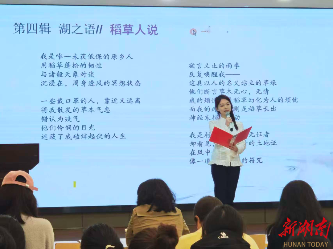 活动现场,张子健、袁咪雅、童雅俐、蒋好等大学生诗歌爱好者先后朗诵了《大湖之骨》《传说中的一只水童》《青草湖》《稻草人说》等诗作,声情并茂的演绎让在场师生深刻感受到诗歌的艺术魅力。