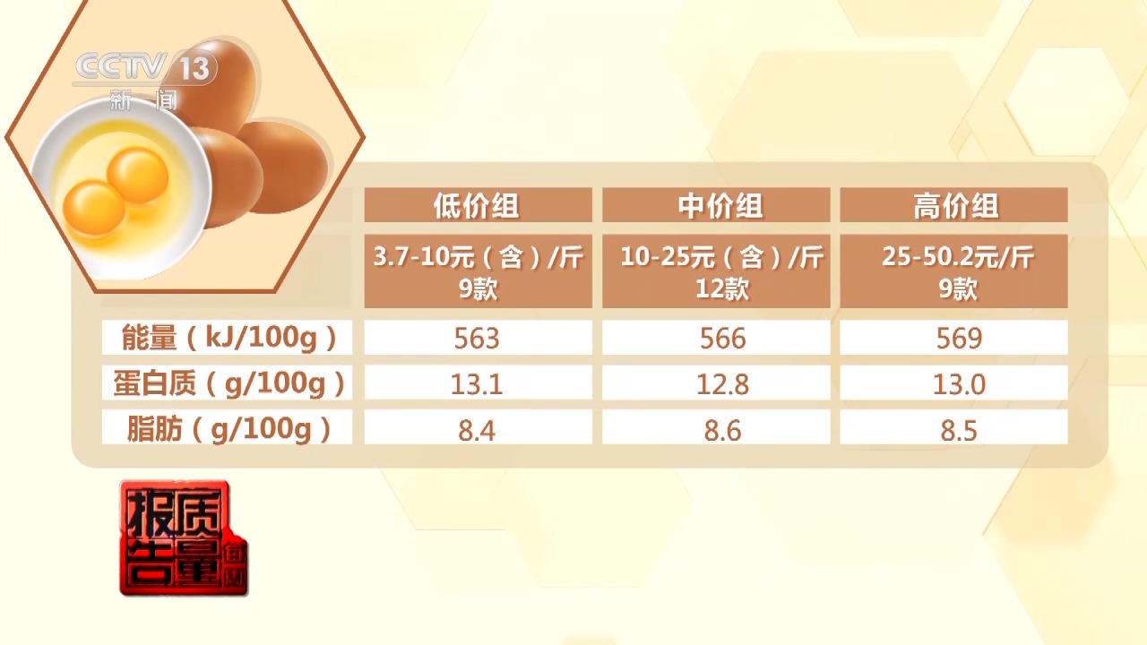 上海市食品研究所检测中心总监 赵俊虹:这个就是鸡蛋的天然营养组成成分,比如说蛋白质、脂肪,跟价钱关系是不大的。