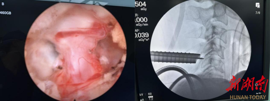 结合患者病情,考虑他期望快速康复、保留颈椎功能的诉求,岳阳市中医医院脊柱骨科主任刘建国和管床医生易生辉带领团队经过周密术前讨论,决定为其施行目前国内领先的“大通道脊柱内镜下右侧颈4/5、颈6/7椎间盘突出髓核摘除+脊髓神经根粘连松解+射频消融术”。手术过程顺利,出血不到20ml。术后效果立竿见影,患者困扰多时的颈肩痛及右上肢放射痛、麻木等症状全部消失。