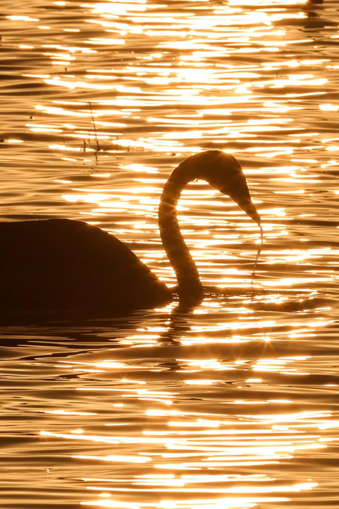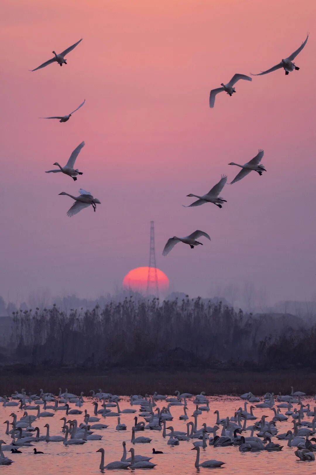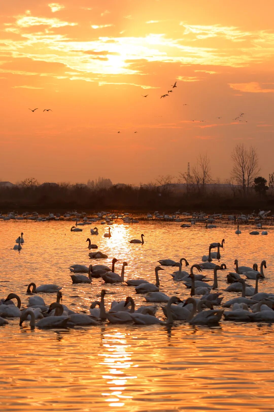 晨光里听天鹅穿雾鸣叫,夕阳下看鸟群归巢剪影。