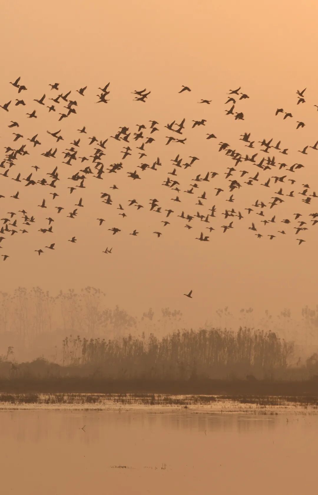 这里工业污染少,农田与湖泊交织,风里飘着秋收残留的稻穗香,混着湖水的腥甜,水稻余粮和鱼虾,恰好成了候鸟的越冬口粮。