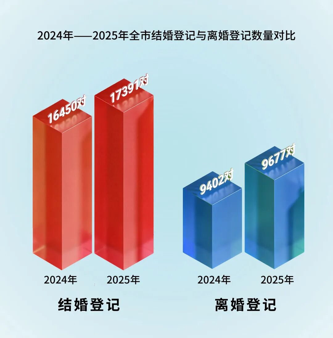 2025年,岳阳人的婚姻“坦白局”来了。大数据里,藏着岳阳人最真实的爱情密码1月16日,从岳阳市民政局获悉,岳阳市2025年婚姻登记数据正式发布。2025年:17,391对2024年:16,450对同比增加941对📈2025年:9,677对2024年:9,402对同比增加275对 📈在结婚年龄方面,2025年结婚登记总平均年龄为32.8岁,普遍推迟。其中:数据看点结婚年龄比前一年推后,反映年轻人更慎重对待婚姻。离婚平均年龄在 41岁+ ,或对应“中年婚姻调适期”。数据还显示,新人对具有特殊寓意的登记日期依然青睐有加。754对,登记!前一天(5月19日)111对后一天(5月21日)373对热度爆表指数:★★★★★472对,选择传统佳节!对比:前一天86对传统浪漫指数:★★★★☆选“好日子”登记,是岳阳新人给婚姻的第一份仪式感。爱情需要纪念日,婚姻更需要用心经营的开端。综合来看,岳阳市婚姻状况呈现结婚量稳中有升、结婚年龄普遍推迟的特点。选择在象征美好爱情的传统节日或谐音吉日登记,依然是不少新人赋予婚姻生活浪漫开端的重要方式。(陈丽虹 汤昌嵘)