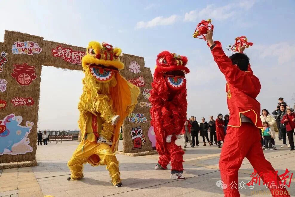 湖南日报·新湖南客户端2月15日讯(通讯员 梁静 周洋)今日,2026年河泊潭新春民俗游园会暨稻草人艺术节在屈原管理区河泊潭文化旅游区启幕。活动在精彩的舞狮节目中启幕,醒狮身姿矫健、灵动传神,为现场游客送上美好祝福。