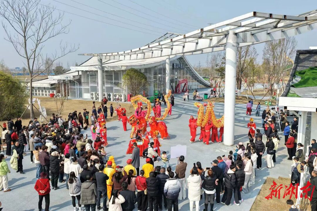 下午3时,“守护好一江碧水”展陈馆主广场锣鼓喧天。许市舞龙舞狮表演精彩纷呈,金龙盘柱、醒狮高桩,龙身里穿插着芦苇扎成的“江豚浪花”,狮口吐福时吐出一幅“守护好一江碧水”卷轴。“既热闹,又有君山特色!”从岳阳楼区赶来的李女士连连点赞。