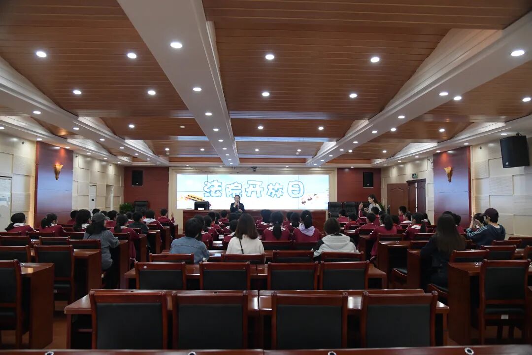 “法庭上这三个位置分别是谁来坐?“同学们踊跃答出:法官坐中间,主持审判;检察官坐左边,指控犯罪;辩护人坐右边,维护被告人权益。在肯定了同学们的回答后,工作人员接着用通俗易懂的语言讲解了法徽、法袍中蕴含的意义。