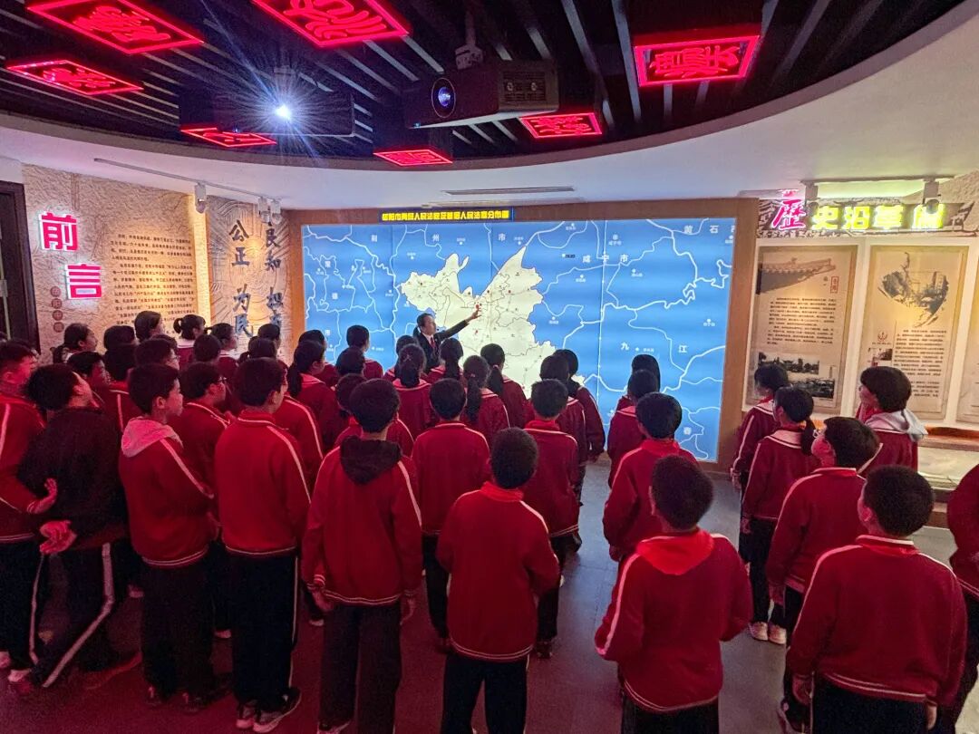 岳阳法院地图带着“小法官”的余温,同学们走进院史陈列馆。一进门,一张完整的岳阳地理版图便吸引了所有人的目光,工作人员向同学们介绍了全市11家法院和39个人民法庭所在位置。